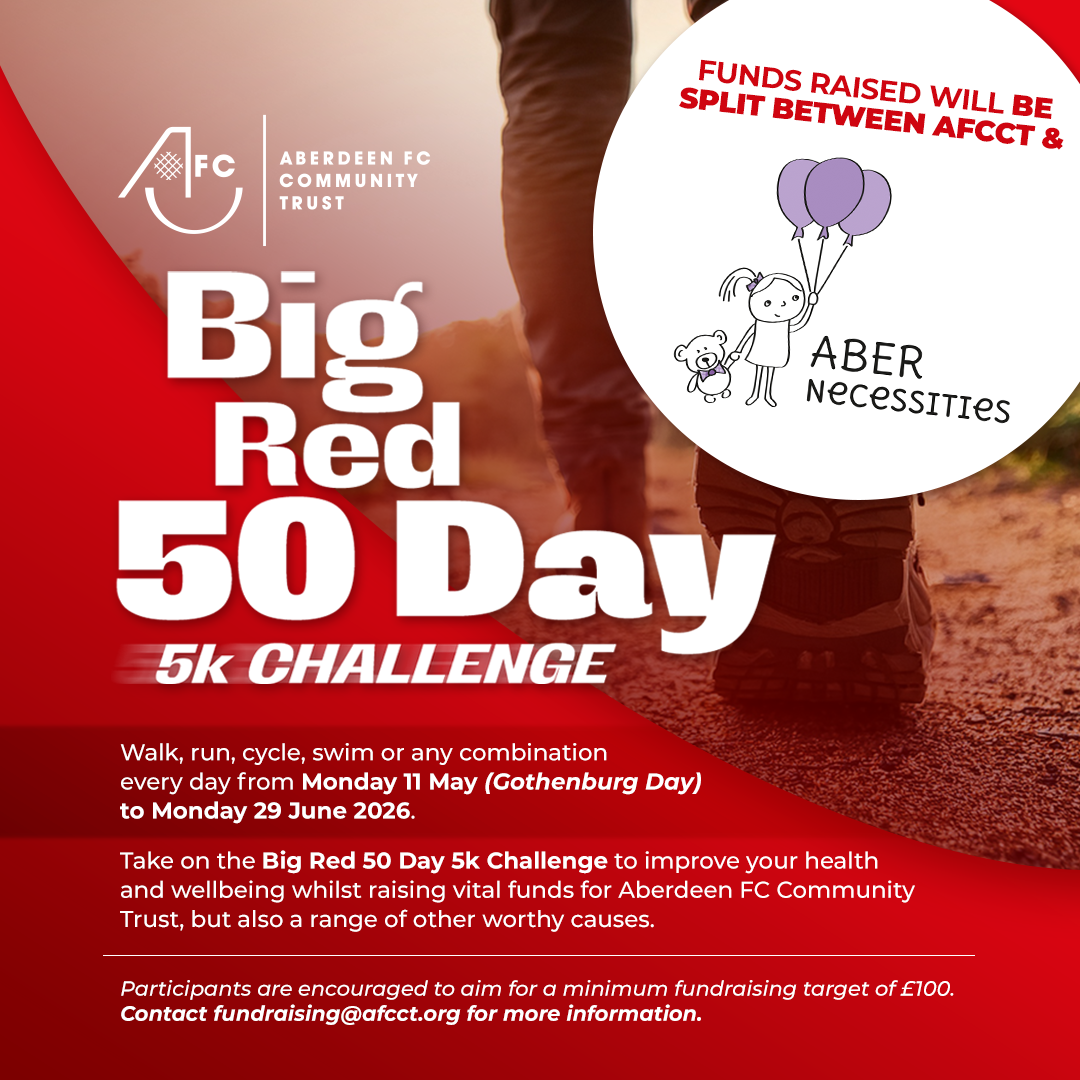 Along the way, you’ll be helping to raise funds and awareness for two local charities — AberNecessities and Aberdeen Football Club Community Trust — both making a real difference to children and families across our communities.